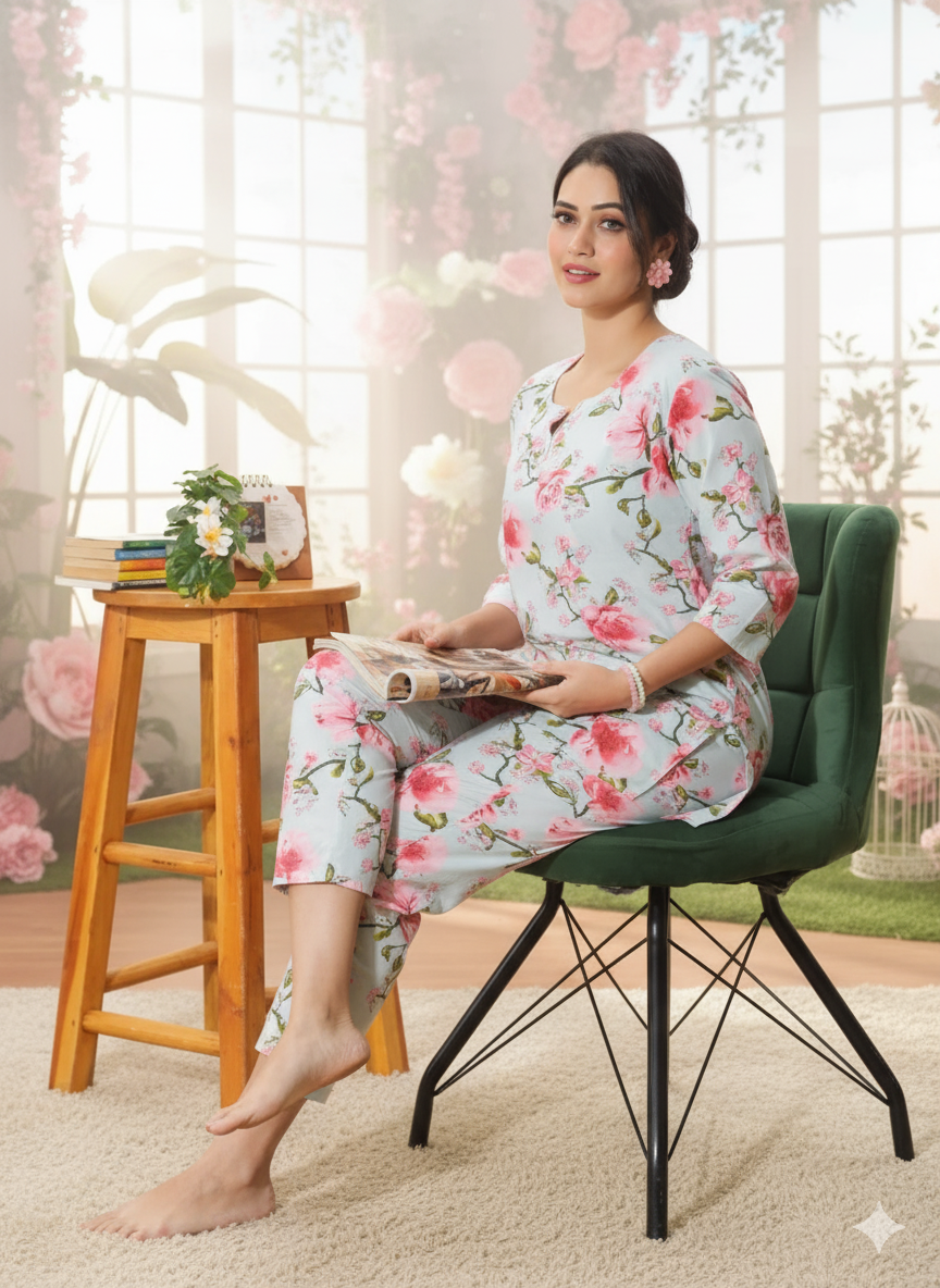 Pink Floral Pure Cotton Night Suit Set for Women with Lounge-Ready Style
