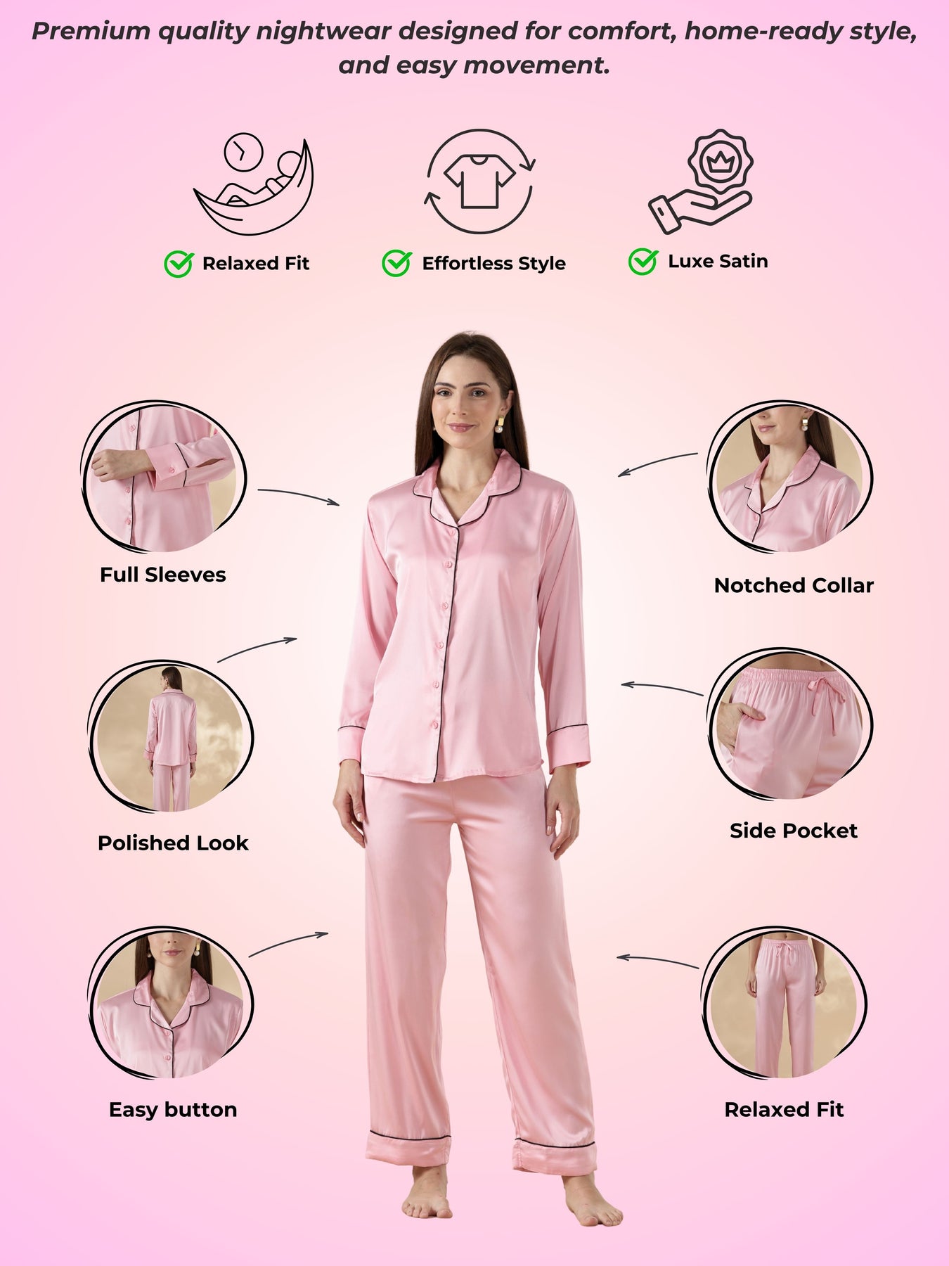 Paris Pink Satin Long Sleeve Loungewear And Pajama Set with Soft Sheen