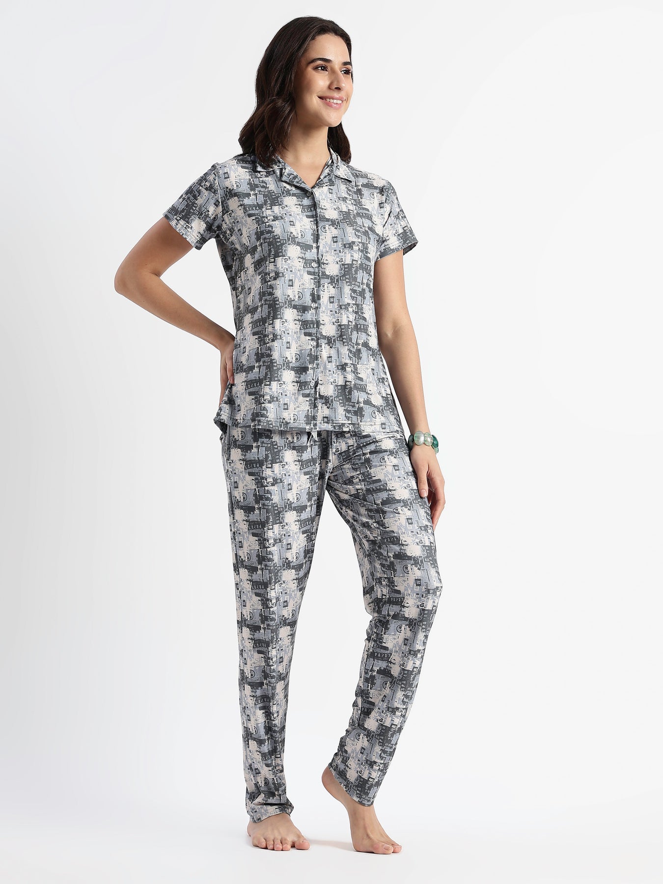 Urban Grey Gloss Malai Pajama Set Soft Collar Night Set