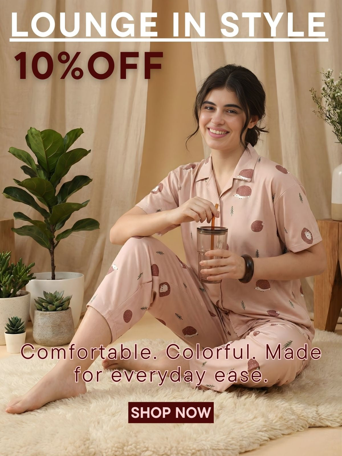 Our loungewear for women features breathable cotton blends and soft polyblends. Summer night suit for ladies options prioritize cooling, moisture-wicking fabrics.