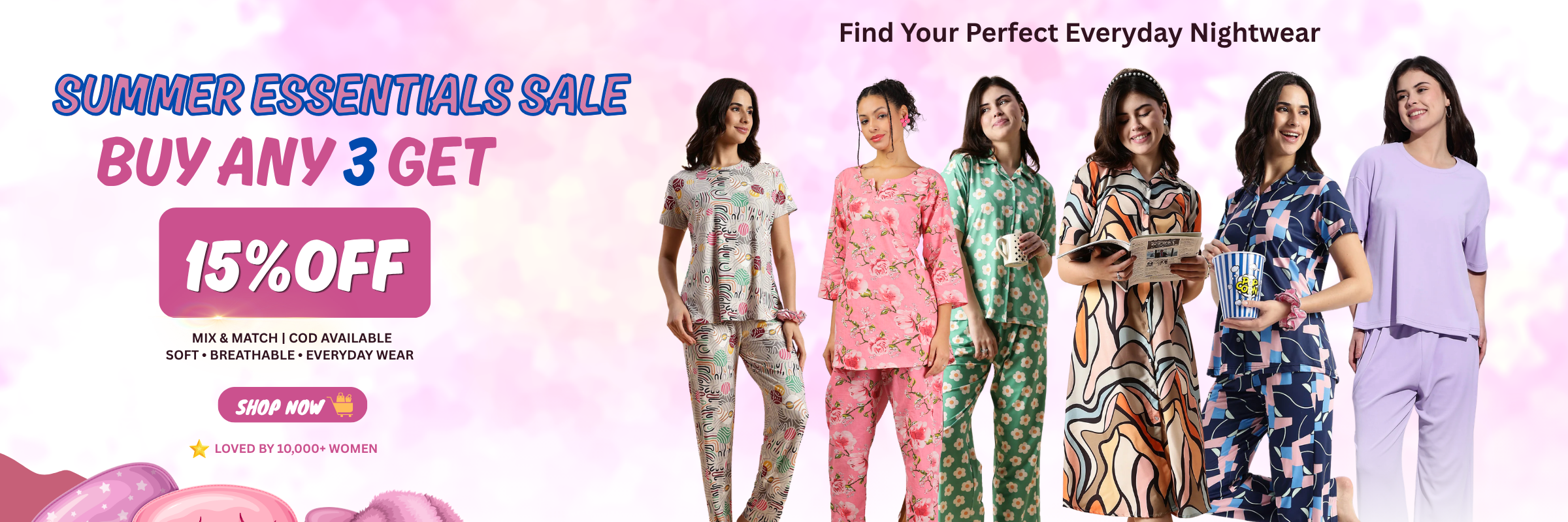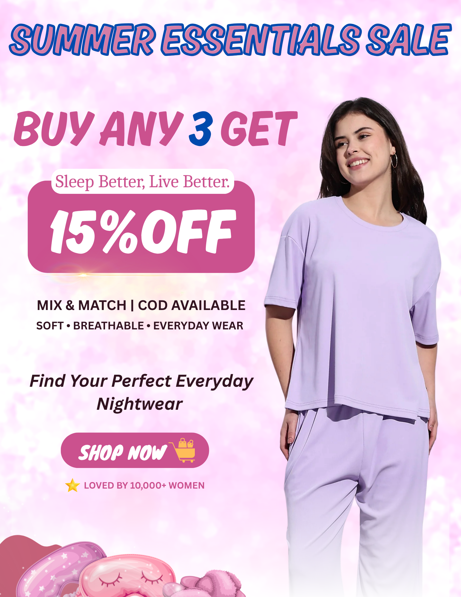 Our loungewear for women features breathable cotton blends and soft polyblends. Summer night suit for ladies options prioritize cooling, moisture-wicking fabrics.