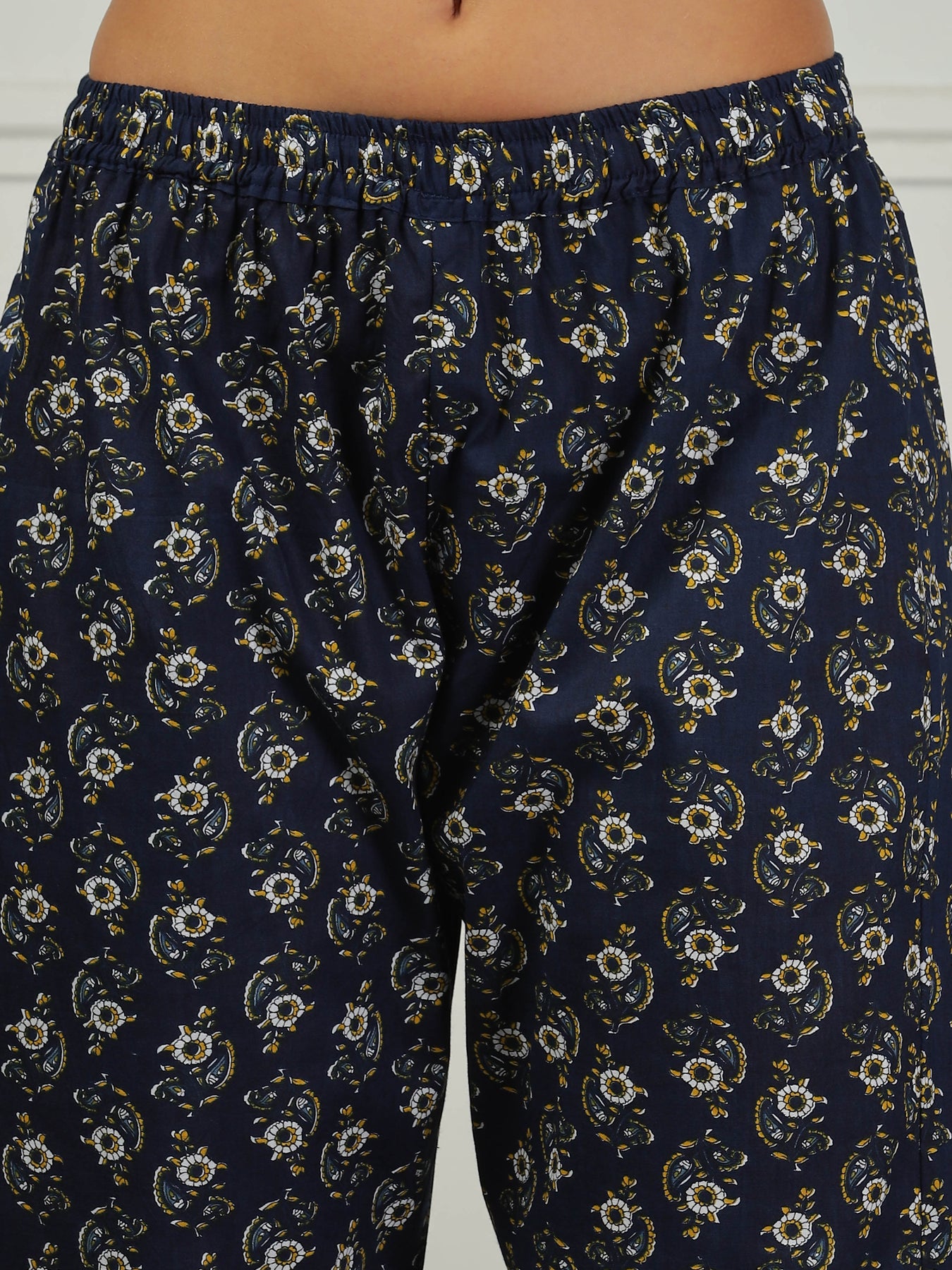 Midnight Blue Floral Cotton Pajama Set for Ladies Soft & Relaxed Fit