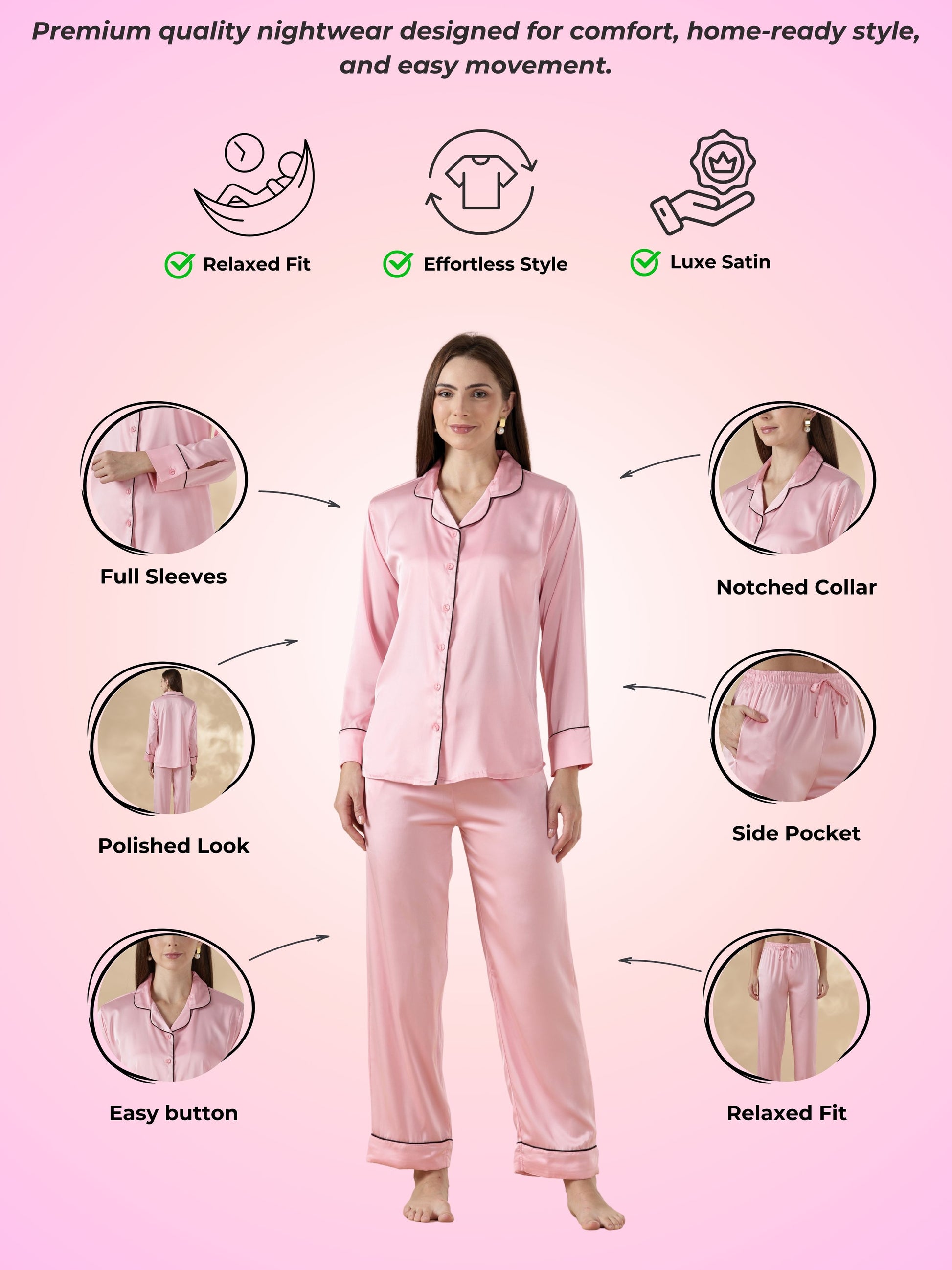 Paris Pink Satin Long Sleeve Loungewear And Pajama Set with Soft Sheen
