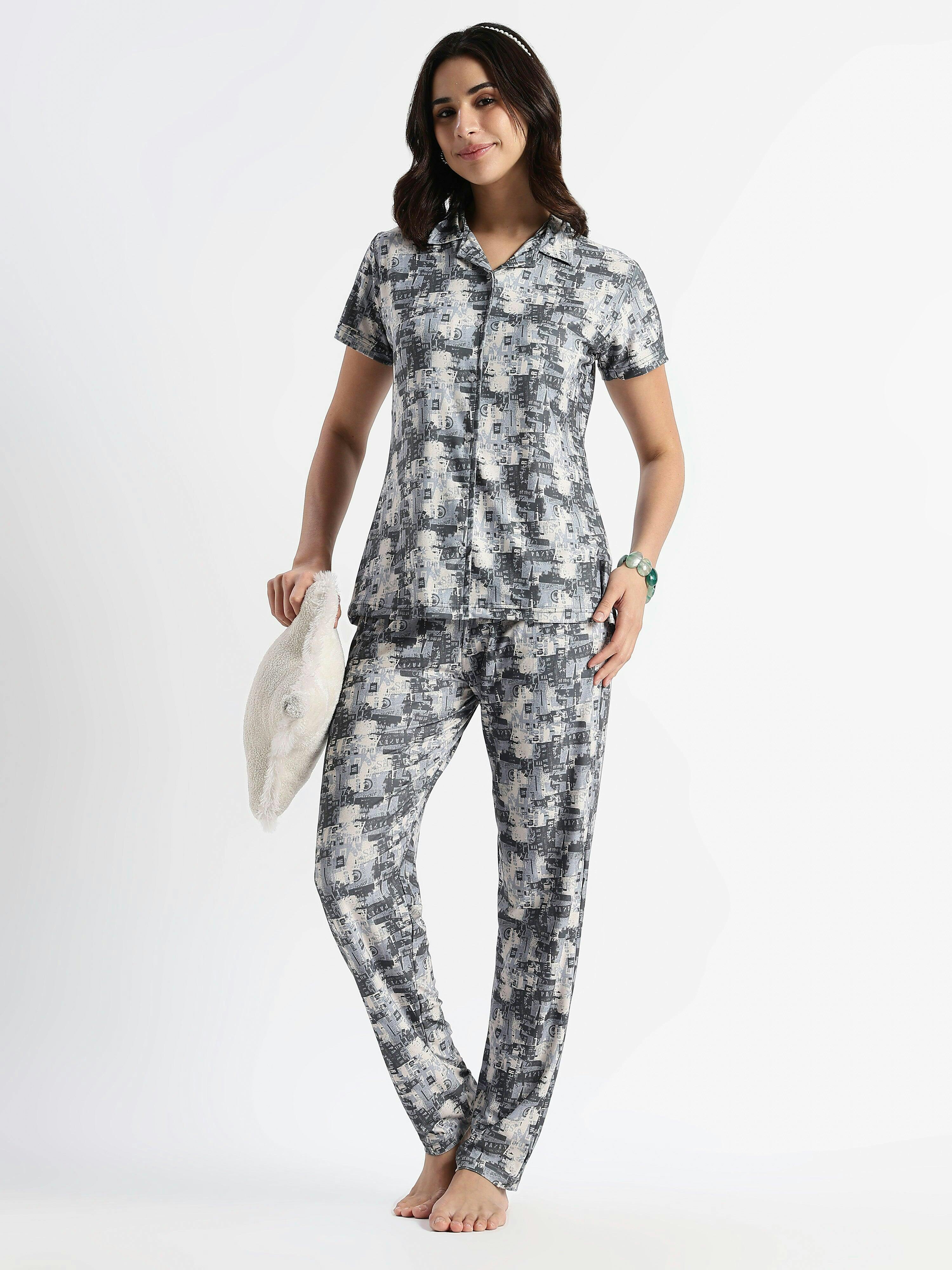 Urban Grey Gloss Malai Pajama Set Soft Collar Night Set